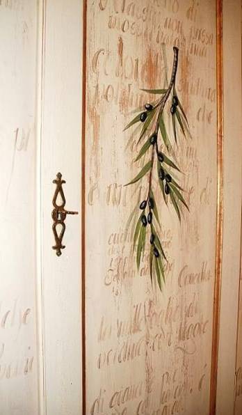 In den abgebildeten Beispielen ist der Schrank jeweils altweiß grundiert, mit Schrift und Oliven sowie Pepperoni-Motiv bemalt und mit Risslack "antikisiert".