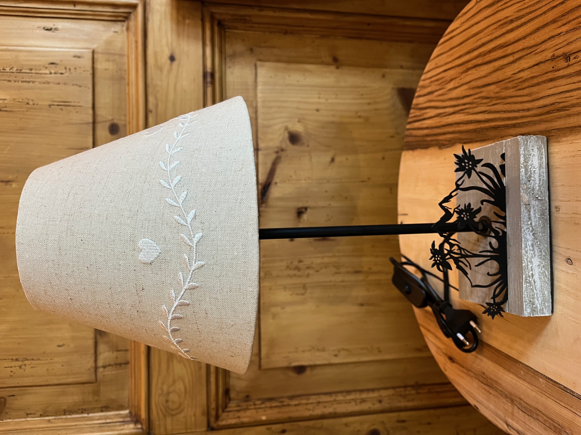 Die wunderschönen Tischlampen sorgen für gemütliche Chalet-Stimmung. Sie haben einen Sockel aus Holz und jeweils ein filigranes Metall-Relief in zwei Ausführungen: